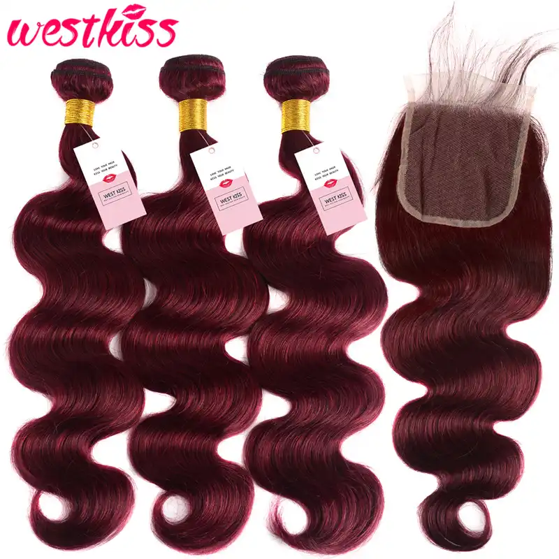 West Kiss Burgundy Bundles With Closure Pre Colored Hair Weave 99j Wine Red 3 4 Bundles Brazilian Body Wave With Closure Remy