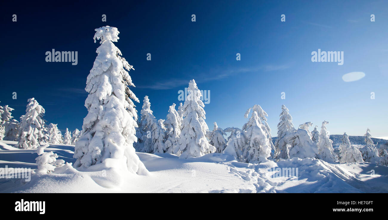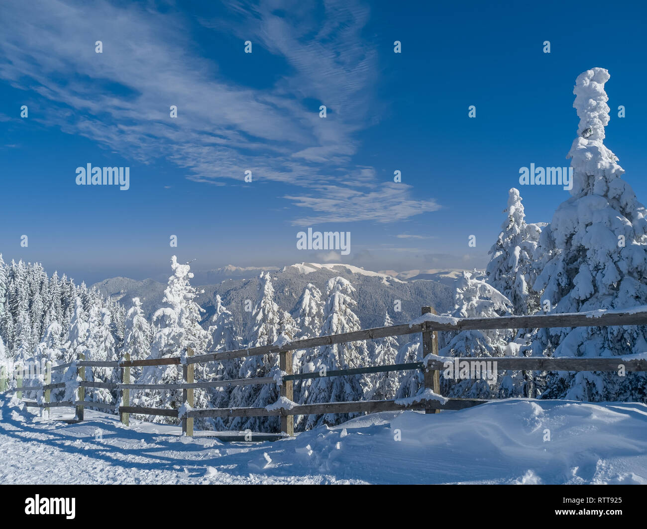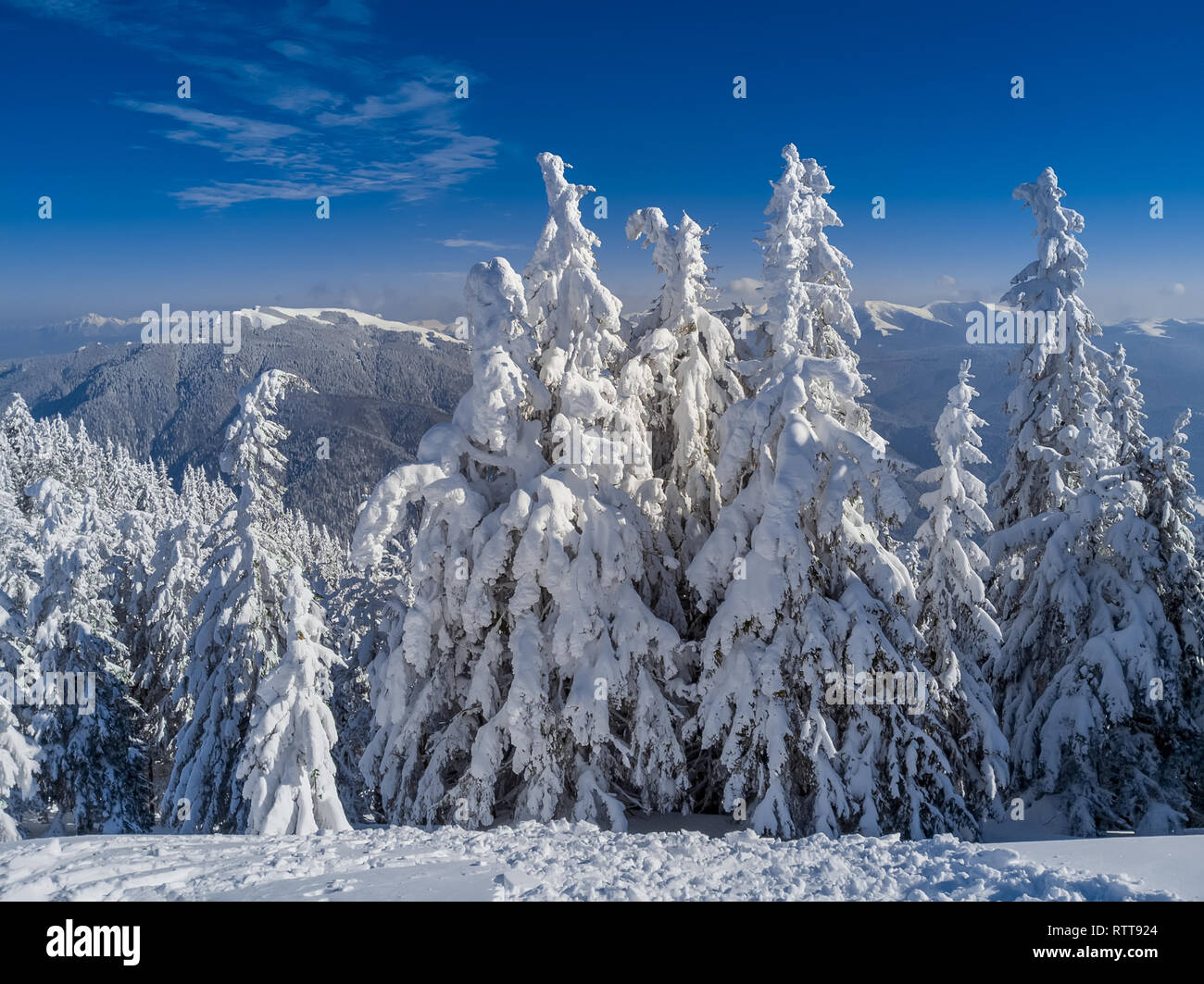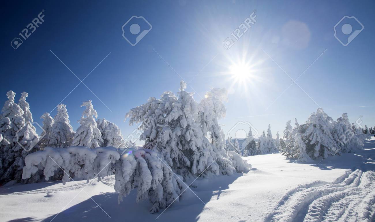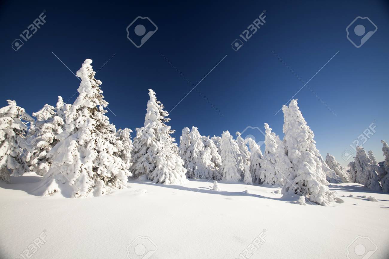 Winter Wonderland Landscape Christmas Background With Trees Covered In Snow Clear Blue Sky For Copy Text And Ciucas Mountains In Brasov Romania