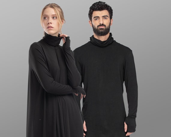 Matching Post Apocalyptic Clothing Black Asymmetric Maxi Dress Loose Turtleneck Sweater Couple Futuristic Cybergoth Outfit Gothic Casual